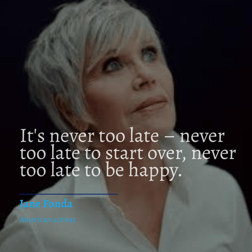 It's never too late – never too late to start over, never too late to be happy. - Jane Fonda